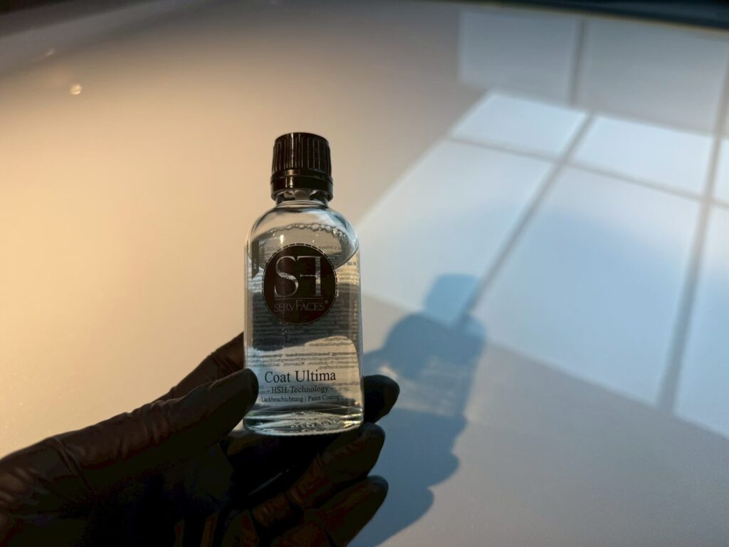今回のお客様は屋外でお車を保管され、日常的に使用されるとのことでしたので、ウォータースポットや汚れが付着しても専用ケミカルで簡単に落とせるよう、薬品耐性と耐久性に優れたservFaces(サーブフェイス)の最高級セラミックコーティングを選定しました。