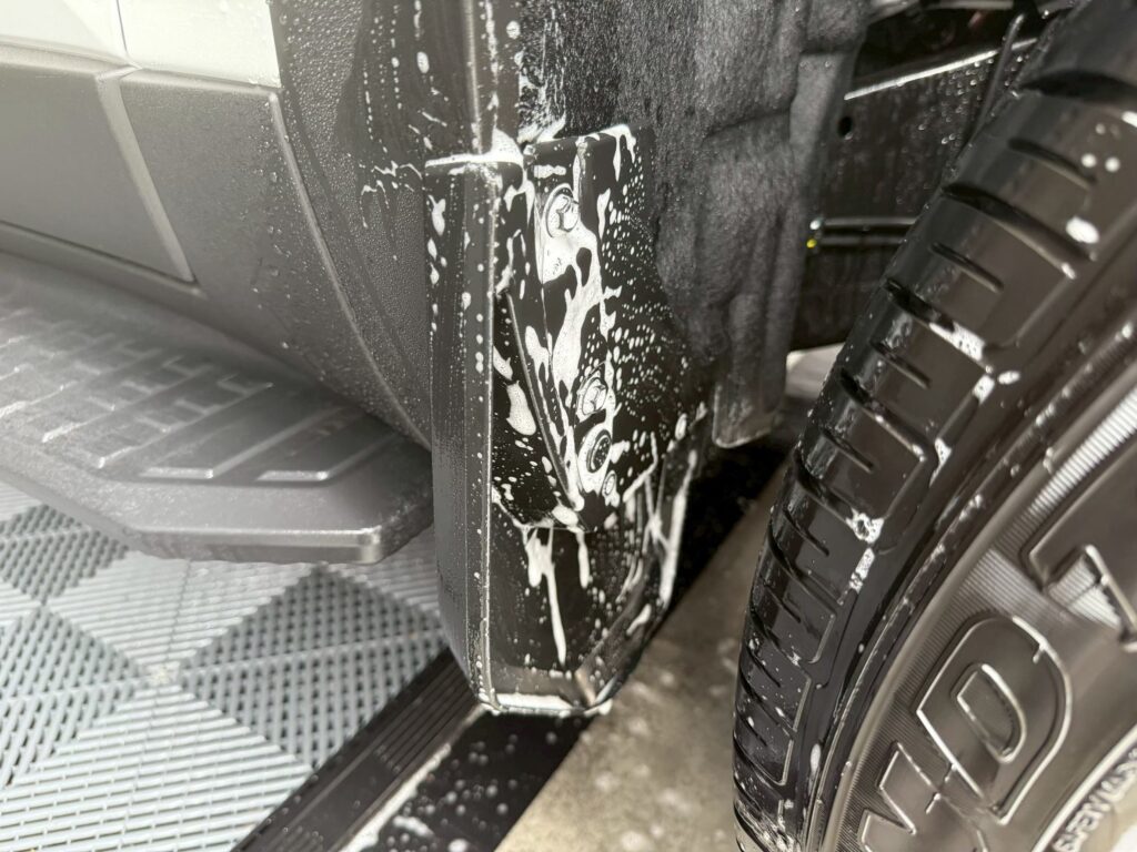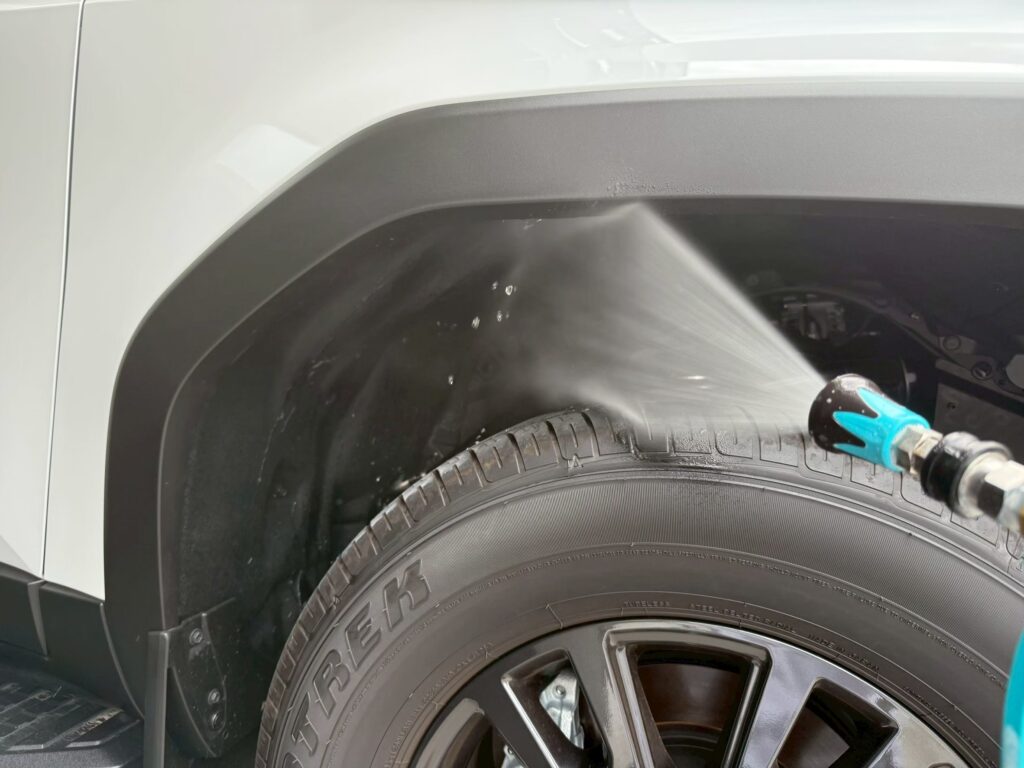 まずはタイヤハウスから。高圧洗浄機を使用し、泥や砂などの汚れを丁寧に洗い流していきます。