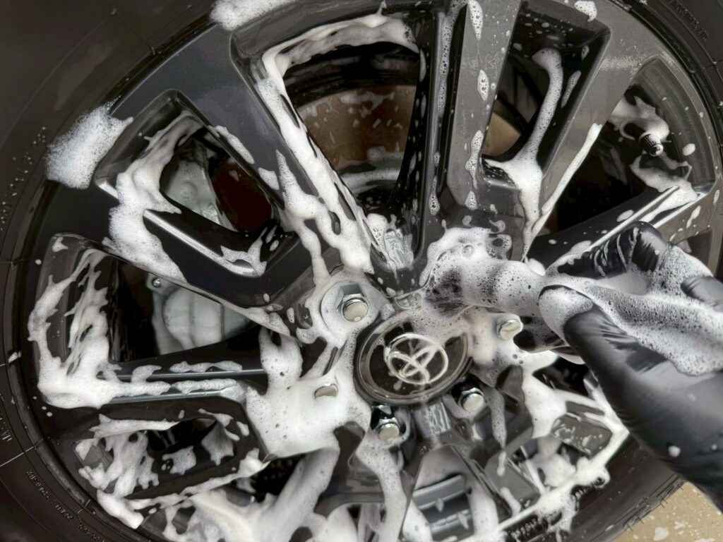 ホイールも、普段の洗車では手が届きにくいナット周りの隙間やリム内側まで、専用ツールを使ってじっくり洗浄します。