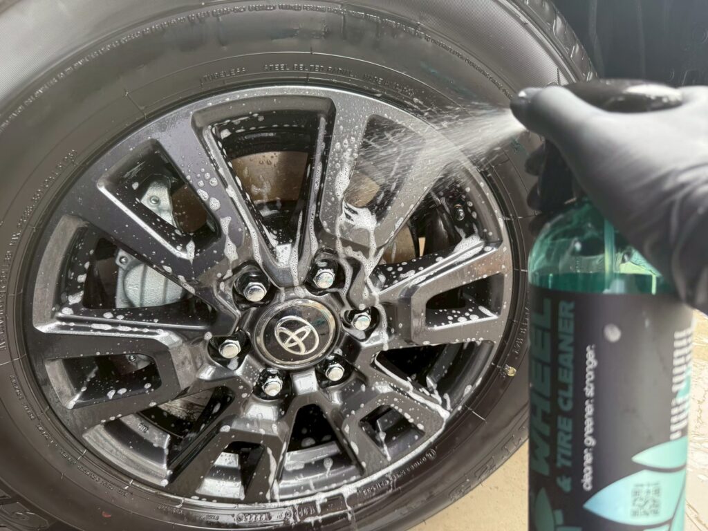 ホイール&タイヤクリーナーを全体にスプレーし、専用ブラシで軽くブラッシング。