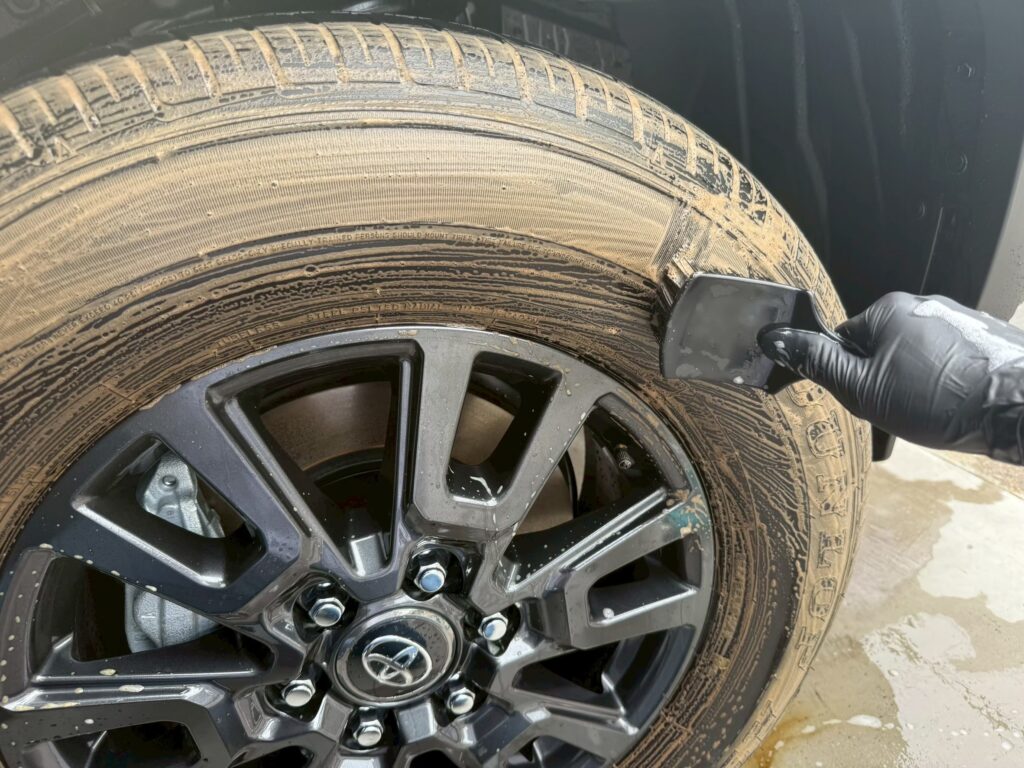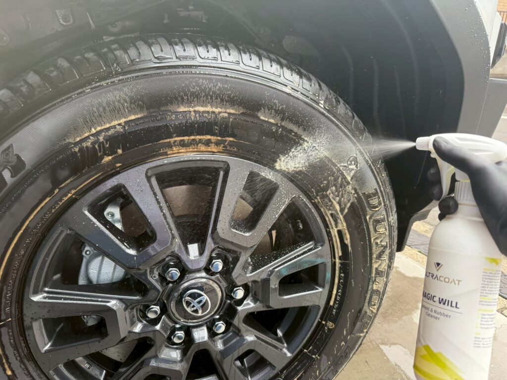 続いて、今回は新作のタイヤコーティングを施工するため、古くなったタイヤワックスをしっかりと除去していきます。
