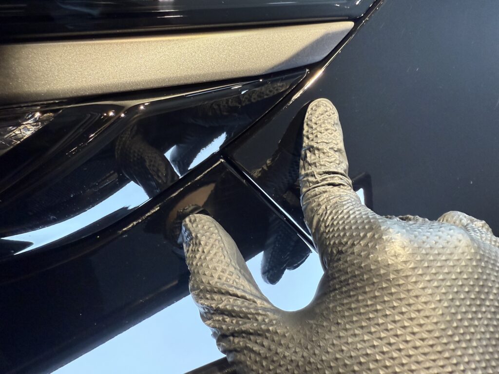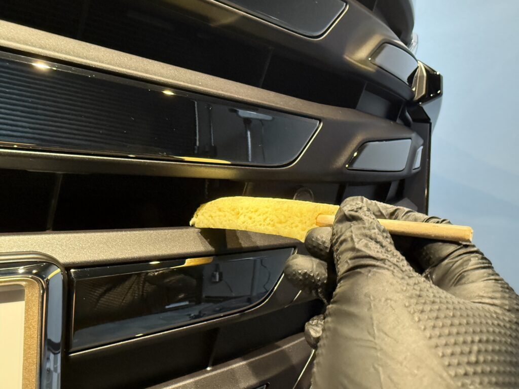 研磨が終わりましたらやっとコーティングの施工になります。綺麗に磨き上げた塗装面に傷がつかないように注意しながら丁寧にコーティングを塗り込んでいきます。フロントグリルの隙間は手が届かずに狭い部分はコーティングが塗れないため、様々なツールを使用しながら丁寧に施工していきます。これで、水に濡れた際も細部までしっかりとコーティングの効果をご体感いただけるかと思います。