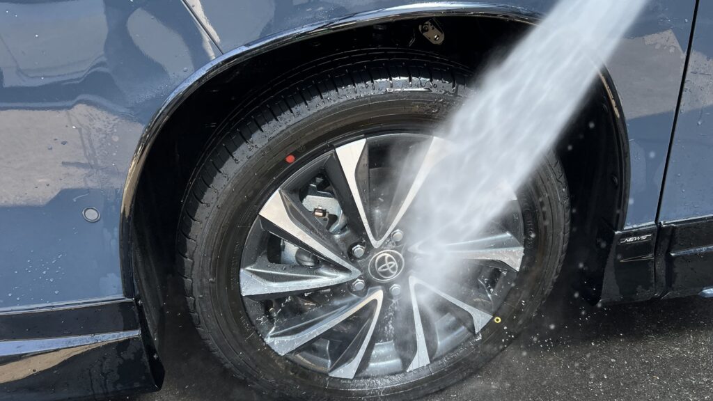 ホイールの洗浄が終わりましたら、タイヤとタイヤハウスも綺麗にしていきます。タイヤもまだ新しく汚れも蓄積していないので、あまり強いケミカルは使用せず、素材に優しい中性クリーナーと高圧洗浄の水圧で綺麗にしたら、水染みにならないようブロワーで水分を吹き飛ばしタイヤカバーで保護します。